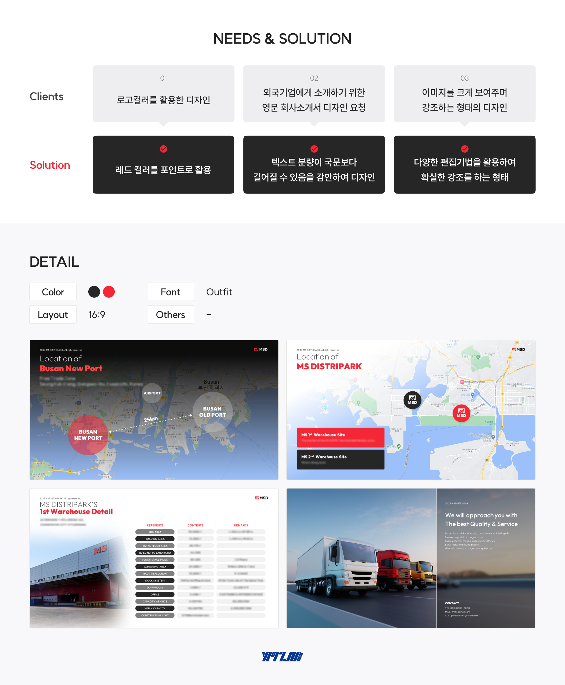 MS DISTRIPARK | 영문 회사소개서 overview 1. 외국 기업에게 회사소개를 위한 영문 회사소개서 2. 이미지를 적극적으로 활용하며 깔끔하게 디자인 회사 로고의 색을 기준으로 톤앤매너를 설정하고 이미지를 위주로 디자인을 진행하였습니다. 이미지를 여러가지 방법으로 표현하여 지루하지 않게 볼 수 있고 확실한 강조를 통해 기승전결이 확실하게 보여 효과적으로 회사를 소개 할 수 있도록 디자인 하였습니다. 클라이언트 MS DISTRIPARK 작업기간 1주 작업분량 13 슬라이드 카테고리 소개서 본문 이전글 개인 포트폴리오 | 최**님 다음글 대구글로벌웹툰센터 조성 및 운영사업 기본계획 수립