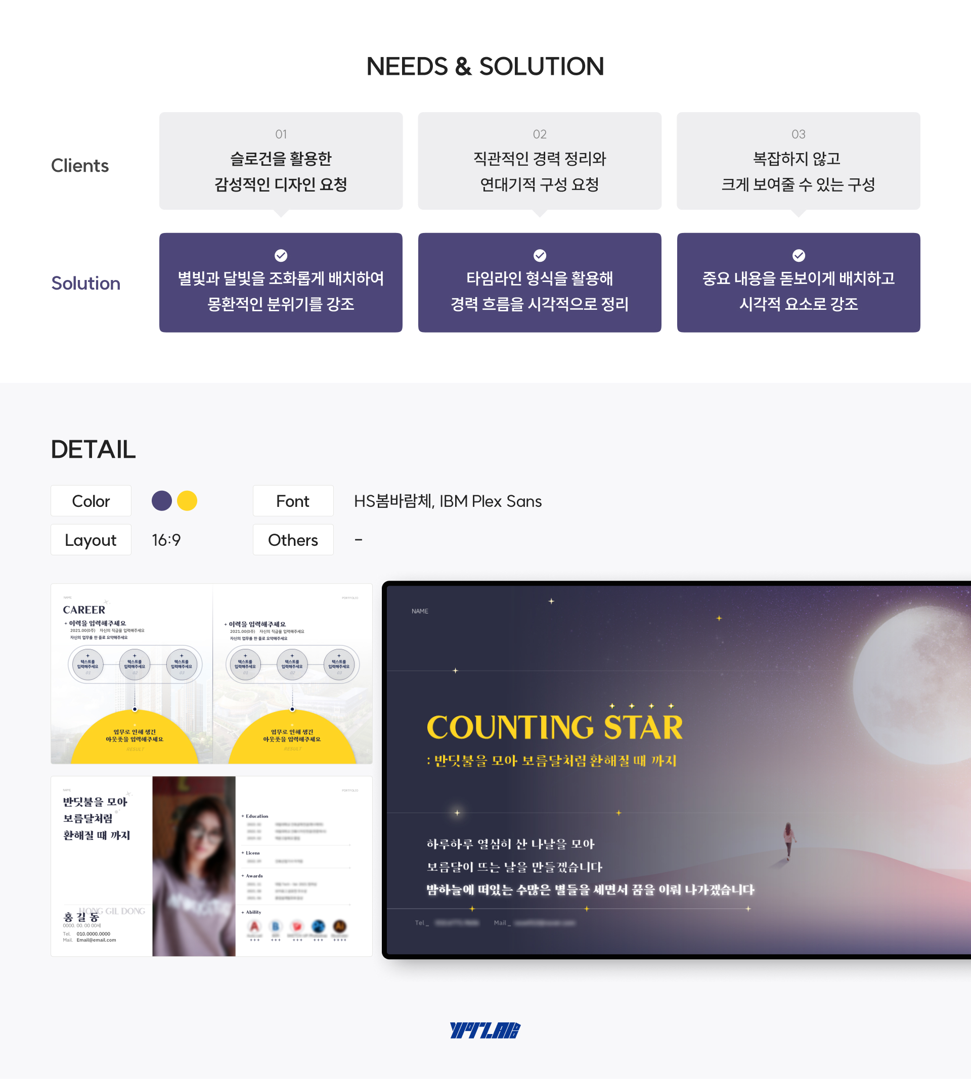 개인 포트폴리오 | 최**님 overview 1. 개인 취업 포트폴리오 2. 개인의 역량을 확실하게 보여줄 수 있는 포트폴리오 의뢰인이 제시한 비전과 슬로건을 반영하여, 별을 컨셉으로 디자인한 감성적인 포트폴리오입니다. 클라이언트 개인 작업기간 1주 작업분량 6 슬라이드 카테고리 포트폴리오 본문 이전글 한국산업단지공단 경남지역본부 현황 및 주요사업 PPT 제작 다음글 MS DISTRIPARK | 영문 회사소개서