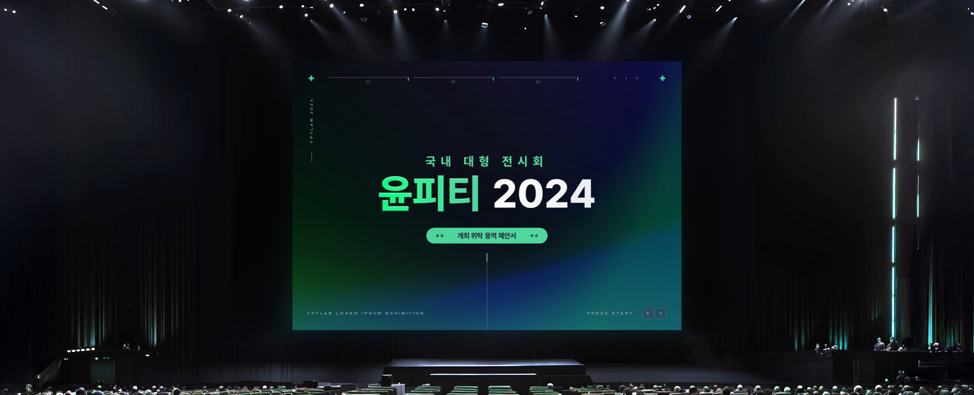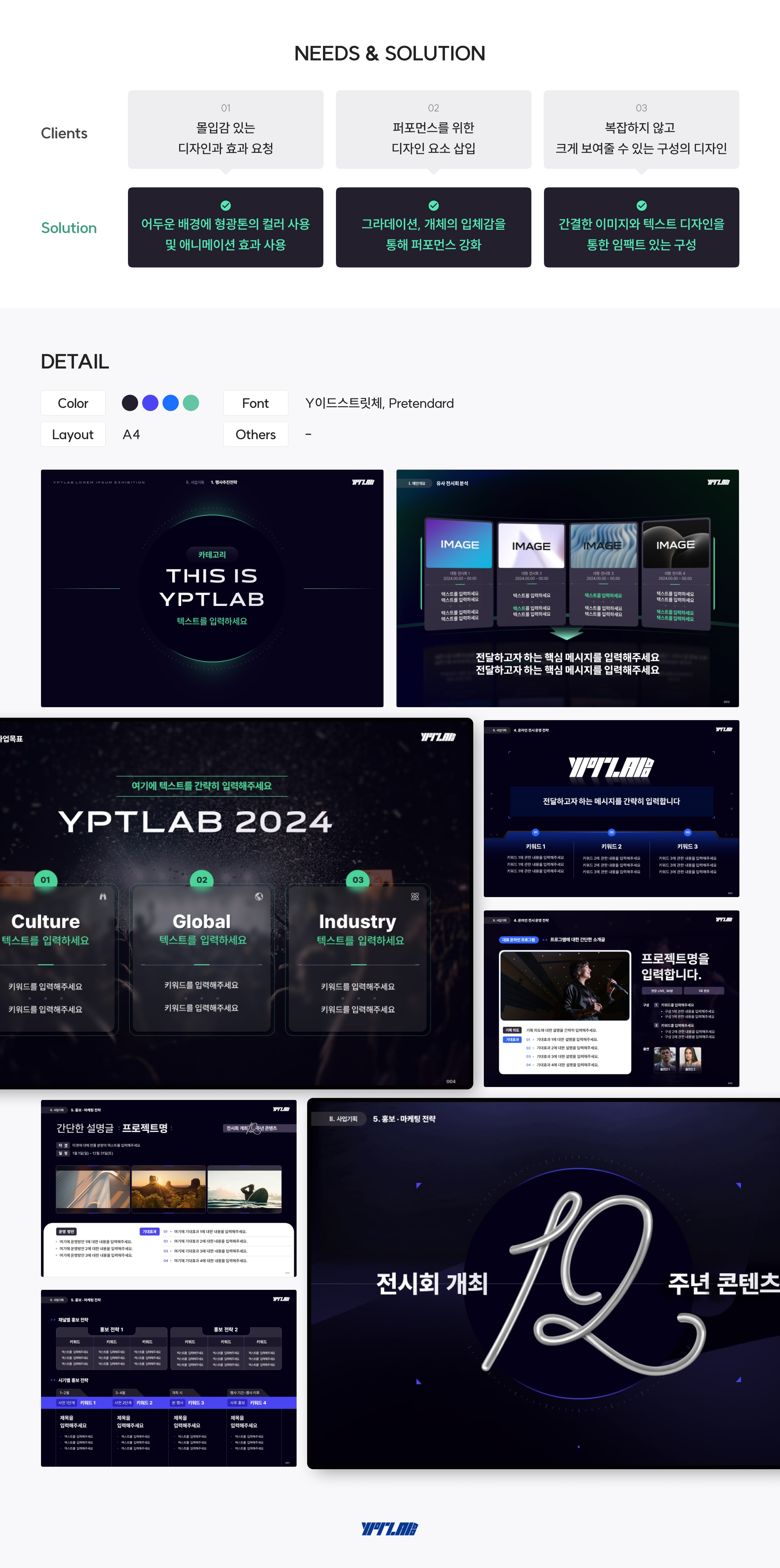 국내 대형전시회 제안서 overview 1. 국내 대형전시회 개최 위탁 용역 제안서 대량 작업 2. 무게감 있는 배경, 여러 애니메이션 및 전환효과 활용 해당 작업에서 가장 신경 쓴 부분은 전반적인 컨셉, 가독성, 그리고 퍼포먼스 요소들이었습니다. 전시회에 적합한 컬러감을 설정하면서도 고급스럽고 세련된 느낌을 표현하기 위해 그라데이션과 어두운 배경을 활용했습니다. 많은 개체를 넣기보다는 간결하면서도 임팩트 있는 디자인을 중심으로 고려하여 제안서를 제작했습니다. 클라이언트 비공개 작업기간 4주 작업분량 약 100 슬라이드 카테고리 제안발표자료 본문 이전글 경쟁입찰 제안서 PPT 제작 다음글 HPE | IBK 기업은행 제안서