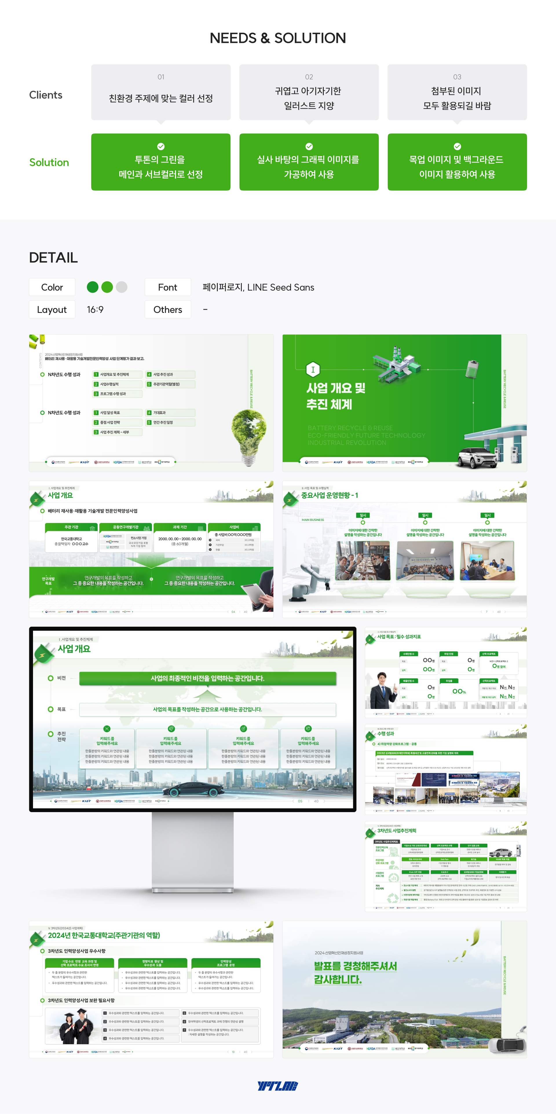 국립한국교통대 결과 보고 발표자료 overview 1. 가독성 높은 형태의 디자인 작업 2. 관련 그래픽 작업 내포 친환경 키워드에 맞는 초록색 컬러를 기반으로 하고, 관련 그래픽들을 활용하여 전체적인 톤앤매너를 형성했습니다. 세부 콘텐츠들의 구조화를 핵심적으로 고려하여 작업하였습니다. 클라이언트 국립한국교통대 작업기간 3주 작업분량 40 슬라이드 카테고리 보고 발표자료 본문 이전글 화성시 생명존중위원회 발표 보고자료 다음글 경쟁입찰 제안서, 사업제안서 PPT 제작