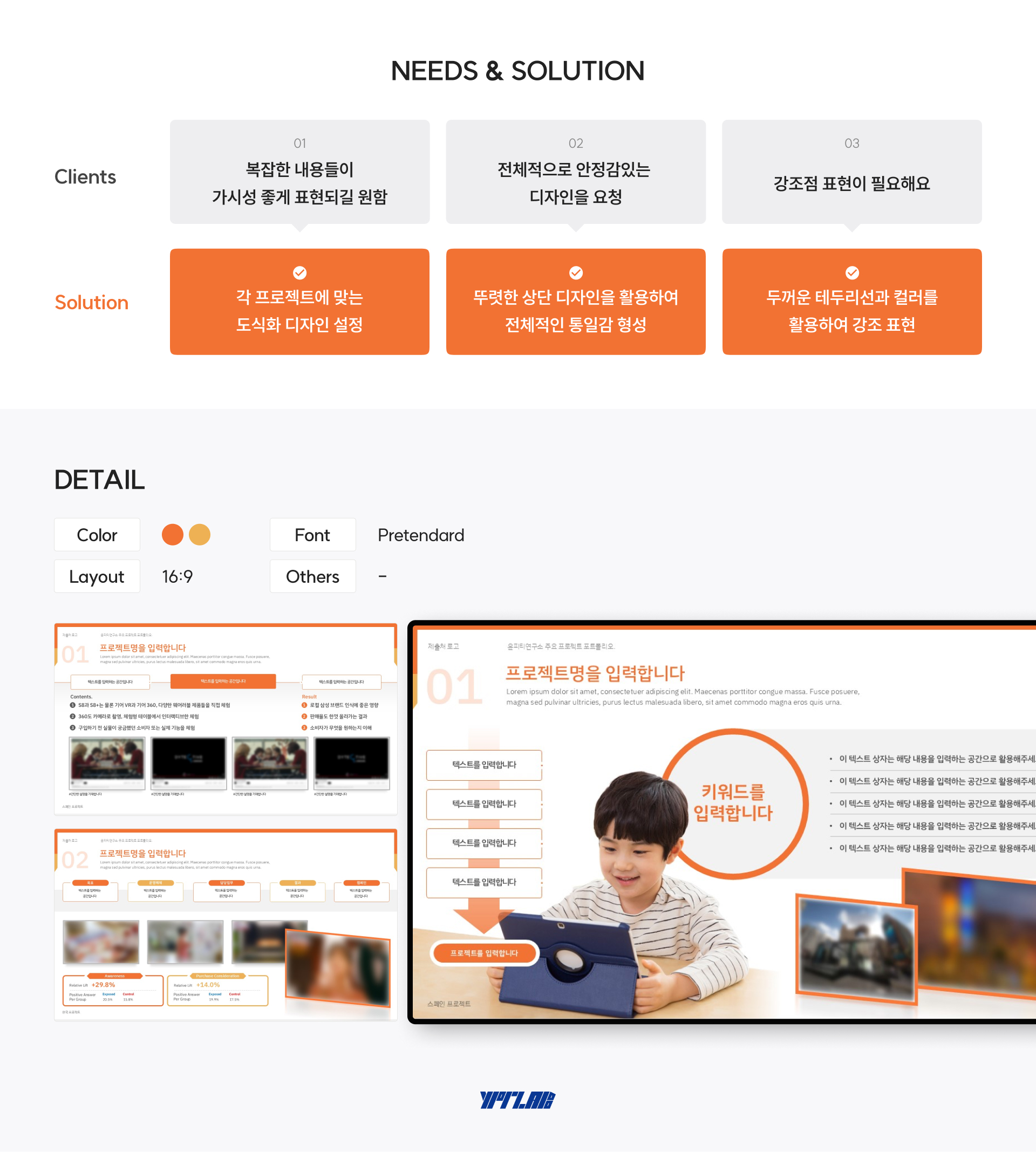 다양한 프로젝트를 진행한 클라이언트의 경력을 고려하여 각 프로젝트들로 구분하여 세부적으로 프로세스, 결과들을 기준으로 또렷하게 전달될 수 있도록 디자인 작업을 진행했습니다.