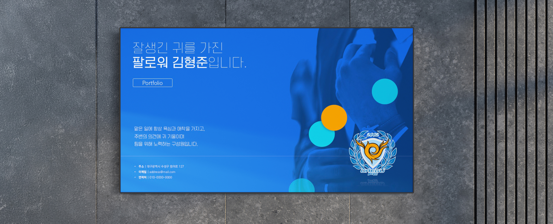 상반기 채용, 취업 포트폴리오 overview 1. 지원사의 CI를 활용하여 맞춤형 포트폴리오 제작 2. 많은 텍스트들이 잘 전달될 수 있도록 키워드 및 구조화 작업 진행 첫 취업을 위한 졸업 직전의 대학생 포트폴리오 제작 의뢰였습니다. 지원사(대구FC)가 명확했으며, 그에 맞는 톤앤매너를 도출하여 작업을 진행했습니다. 공모전/대외활동/대학생활의 경험 중에서 자신의 역량과 강점을 보여줄 수 있는 부분이 최대한 잘 전달될 수 있도록 작업했습니다. 클라이언트 개인 작업기간 2주 작업분량 약 20 슬라이드 카테고리 포트폴리오 본문 이전글 KBS | '찾아가는 바른 우리말 선생님' 강의안 제작 다음글 씨드앤 | 투차 피칭덱
