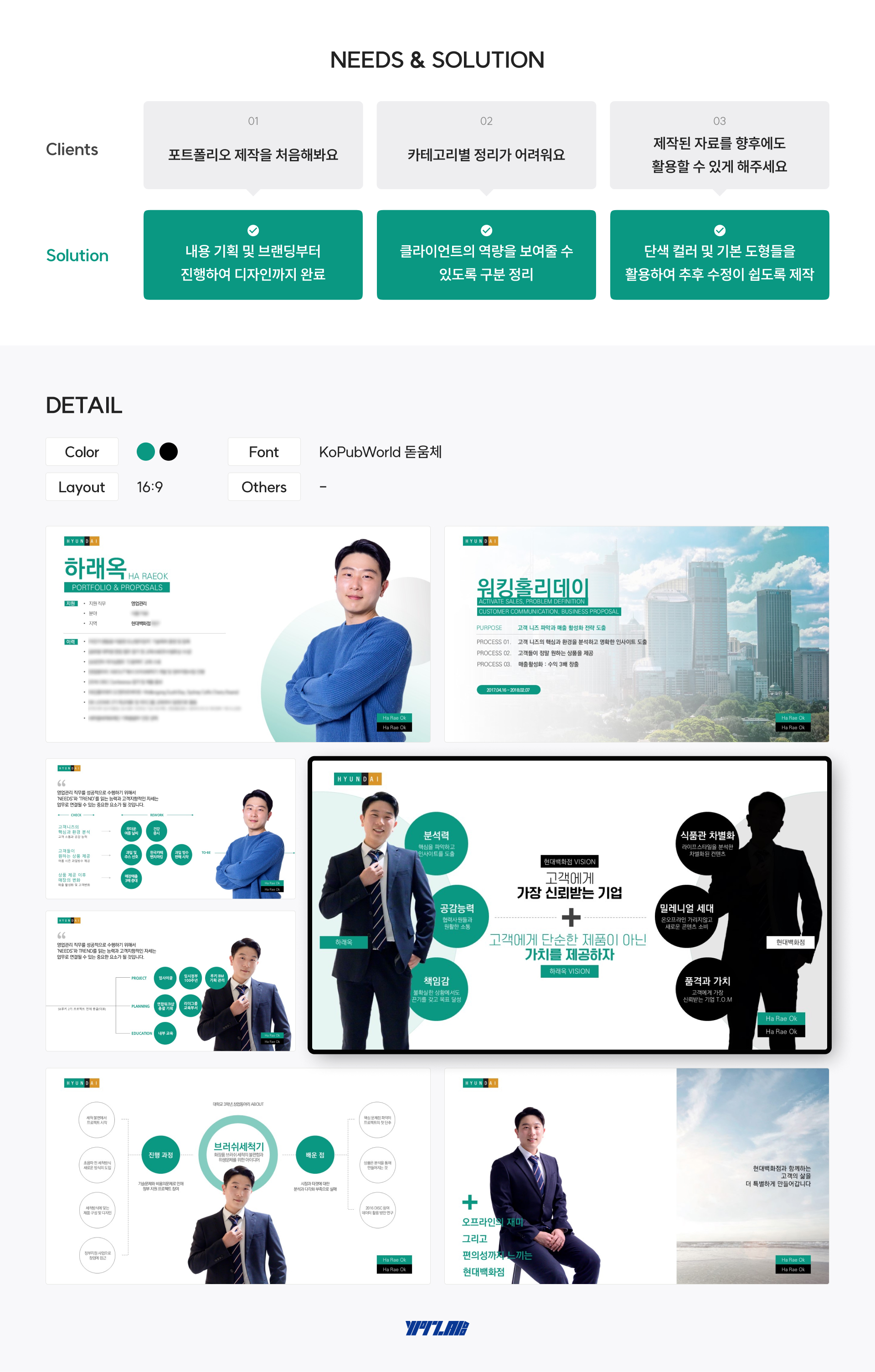 현대백화점 하반기 공채 신입 포트폴리오 overview 1. 다양한 카테고리의 경험/경력을 가독성 좋게 정리하여 표현한 포트폴리오 PPT 2. 포트폴리오의 세부 콘텐츠들을 키워드화 하여 작업 포트폴리오를 첫 제작해야하는 클라이언트님을 도와 포트폴리오 플로우, 내용 정리, 기획, 텍스트워싱 그리고 디자인과 브랜딩까지 포트폴리오의 A to Z를 진행한 작업입니다. 작업을 하며, 최대한 간결하고 향후에도 활용할 수 있도록 수정이 용이하도록 포트폴리오 PPT를 기획 작업했습니다. 클라이언트 개인 작업기간 2주 작업분량 25 슬라이드 카테고리 포트폴리오 본문 이전글 용산구청 온마음숲, 마음건강 정책브랜드 프레젠테이션 다음글 KBS | '찾아가는 바른 우리말 선생님' 강의안 제작