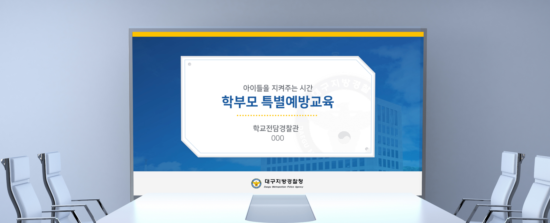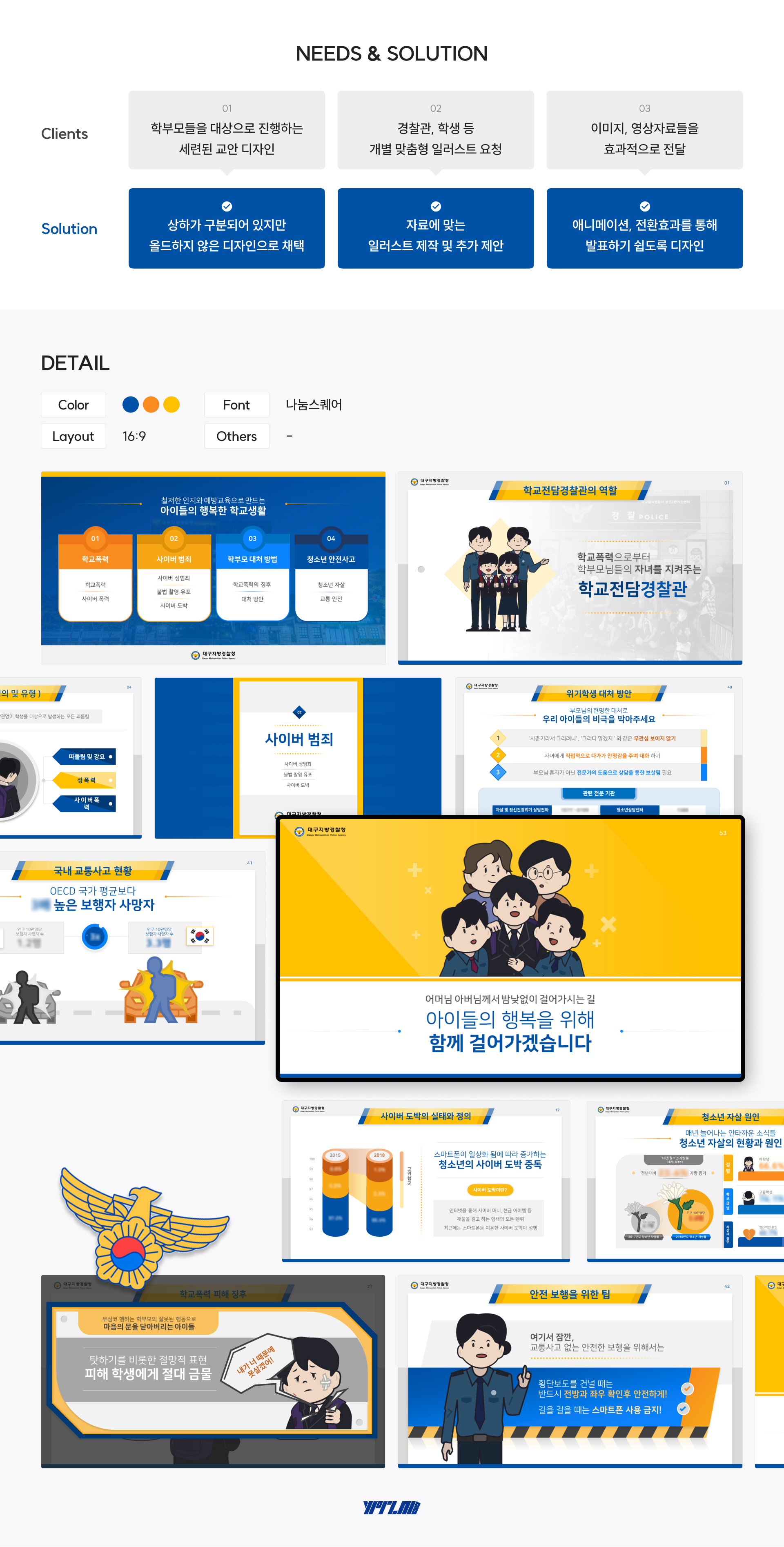 대구경찰청 학부모특별예방교육 교안 overview 1. 학부모들을 대상으로 깔끔하고 세련된 교안 디자인으로 제작 2. 다수의 이미지 및 동영상을 활용하여 사안의 중요성 전달 학생 자녀를 두고 있는 학부모님들에게 최근 발생하는 문제들을 예방하고 대처하기 위한 올바른 방법을 교육하는 강의 교안입니다. 정확한 내용 전달이 잘 될 수 있도록 다양한 시각물(이미지,동영상)을 활용했으며 이해를 돕기 위한 개별 일러스트들을 포함하여 작업한 강의교안입니다. 클라이언트 대구지방경찰청 작업기간 2주 작업분량 51 슬라이드 카테고리 강의교안 본문 이전글 서울시 함께일하는재단 공공프로젝트 다음글 신한은행 제안서