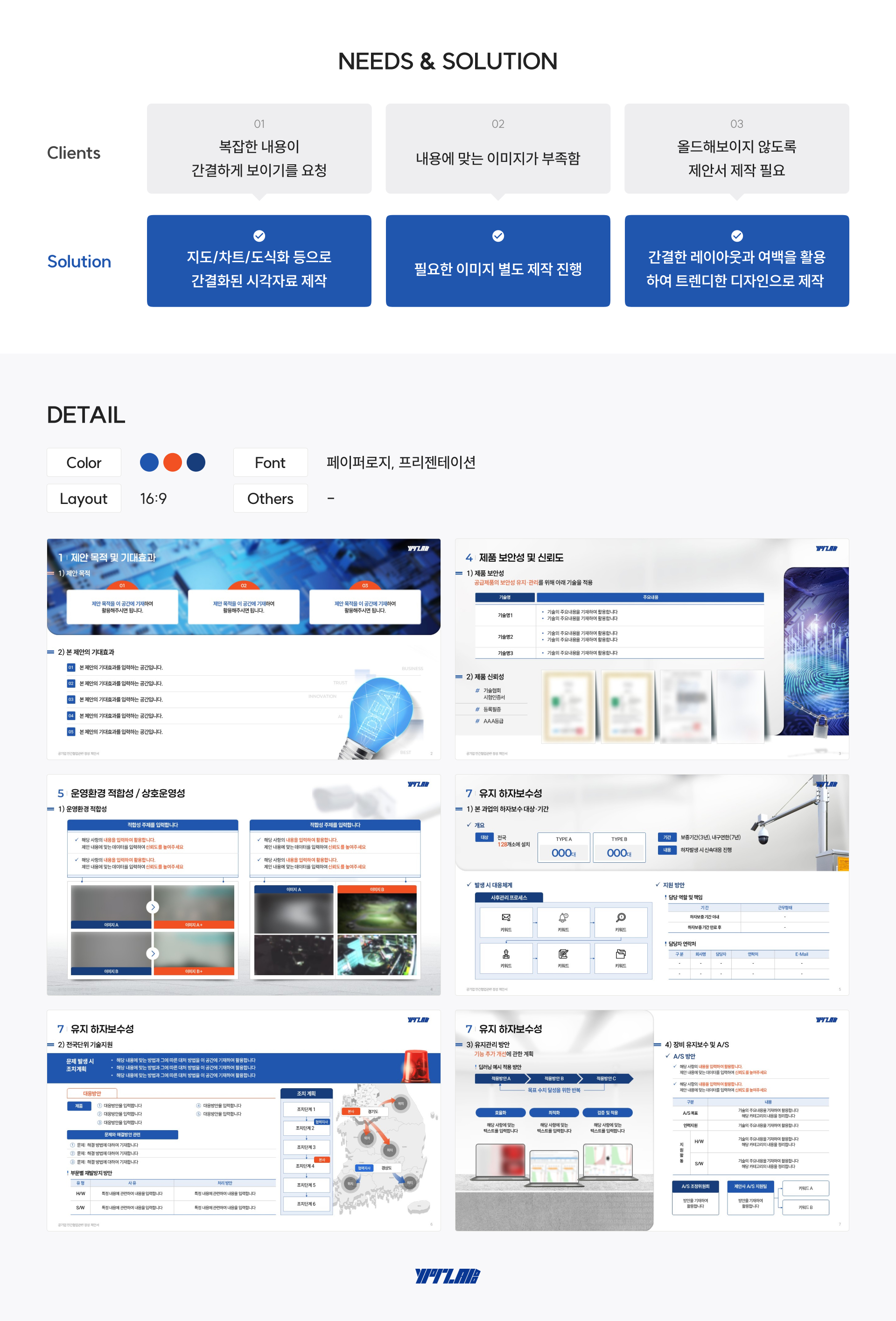 간결한 레이아웃과 여백을 넓게 활용하되, 여백에 내용에 맞는 시각적인 개체(그래픽,이미지,아이콘 등)을 적극적으로 활용한 발표자료로서, 다양한 데이터들이 복잡해보이지 않도록 제작된 자료입니다. 실제 촬영된 이미지들은 저화질 이미지인 경우들이 많다보니 이를 해결해줄 수 있는 장치들을 다양하게 활용했고, 지도와 순서도 등을 다채롭게 활용한 제안서입니다.