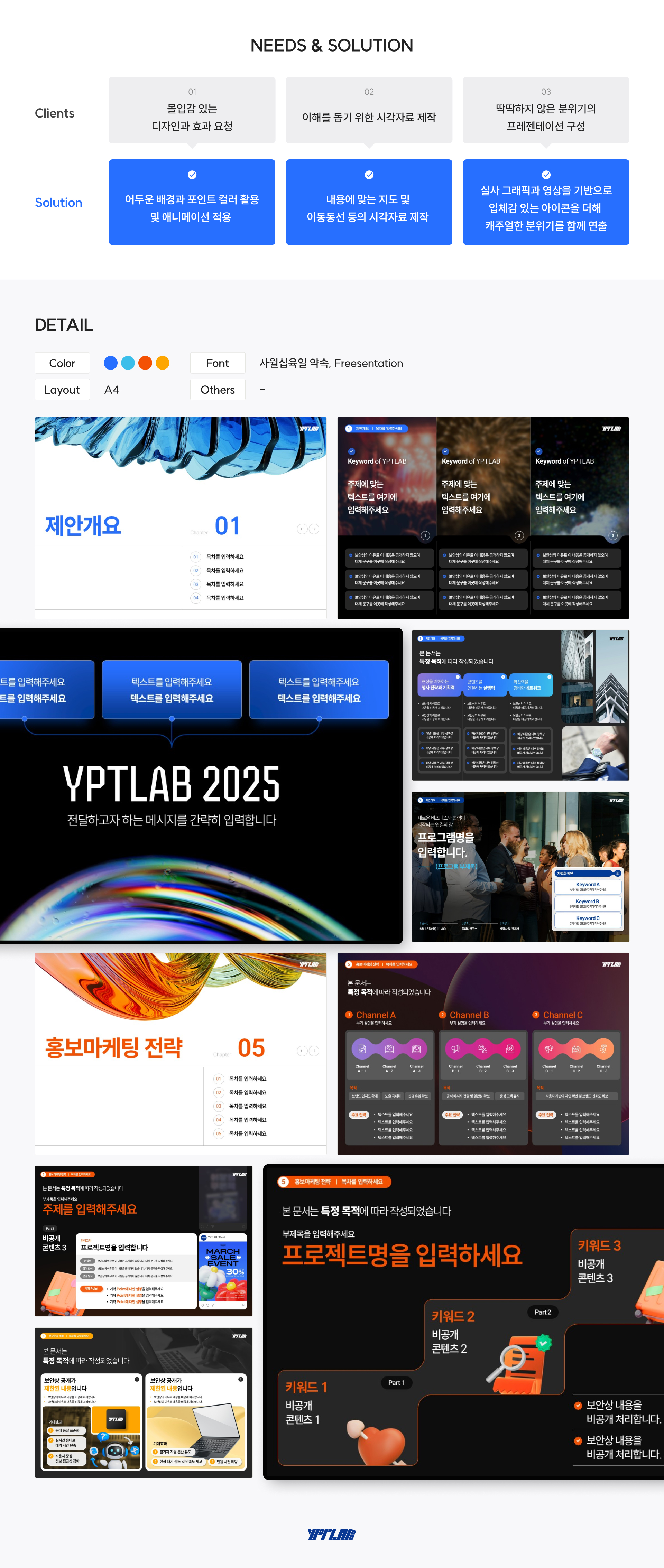 국내 대형 전시회(2025) overview 1. 국내 대형전시회 개최 위탁 용역 제안서 작업 2. 고퀄리티의 발표자료로 다양한 애니메이션 및 전환효과 활용 시각적으로 보여줄 수 있는 다양한 형태의 구조화가 필요한 작업으로, 어두운 배경을 중심으로 하되, 포인트가 되는 컬러들을 활용하여 무겁지않은 분위기로 프레젠테이션이 진행될 수 있도록 하는 것이 중요했습니다. 많은 분량으로 제작이 되는 프레젠테이션으로 전체적인 톤앤매너가 유지될 수 있도록 구성하여 제작했습니다. 클라이언트 비공개 작업기간 4주 작업분량 80여 슬라이드 카테고리 제안발표자료 (위탁용역) 본문 이전글 서울대학교 행정대학원 : 발표자료 제작 다음글 포항 스마트시티챌린지 비전선포식 프레젠테이션 (포스코)