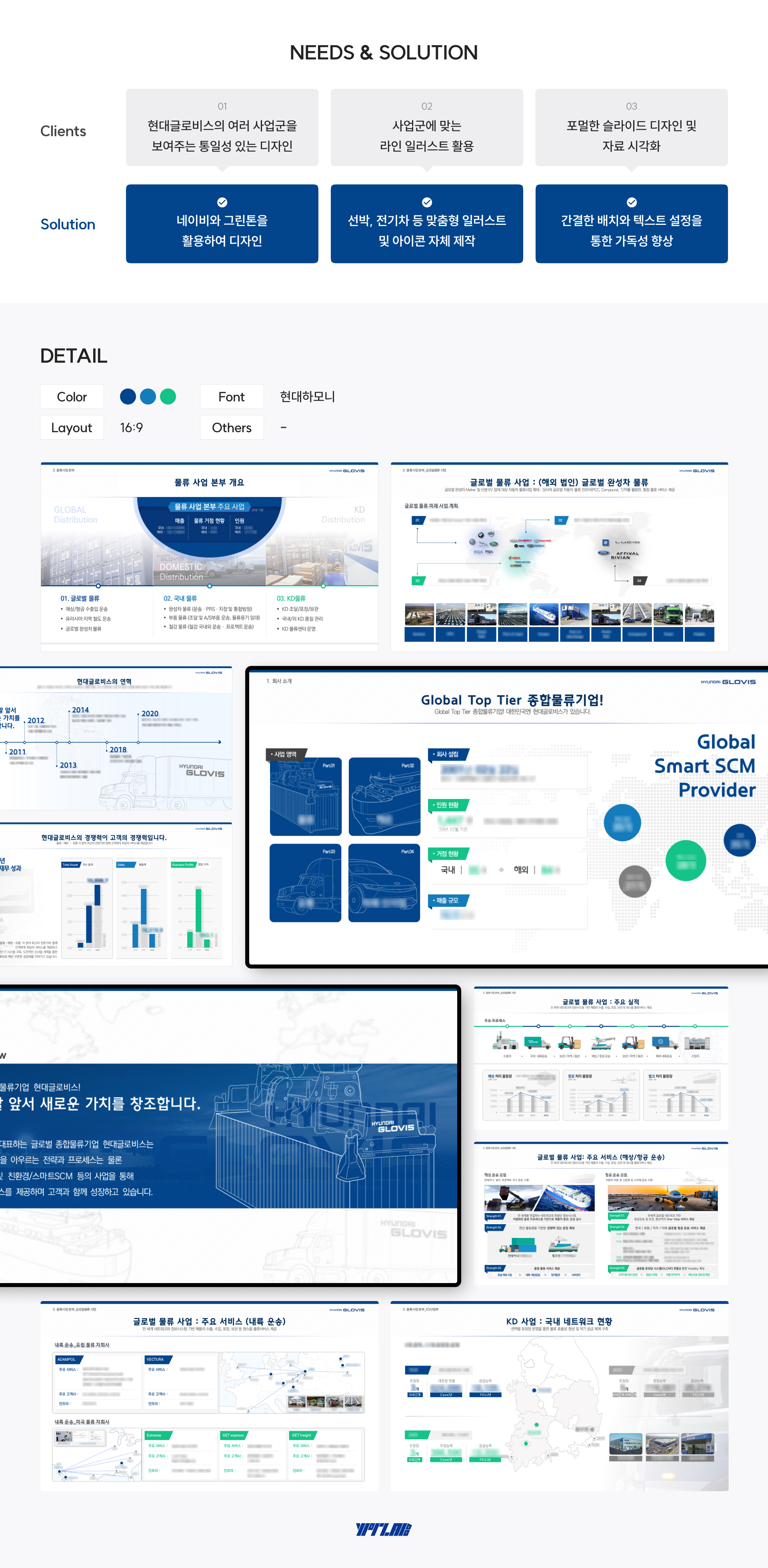 현대글로비스의 여러 사업군들을 모두 포함한 소개서로 제작하며 전체적인 통일감을 유지할 수 있는 톤앤매너를 구성했습니다. VIP들을 대상으로 전달하는 자료이기에 포멀한 느낌으로 슬라이드 디자인을 진행했습니다. 현대글로비스만의 개별 일러스트를 제작하여 제작에 활용했습니다.