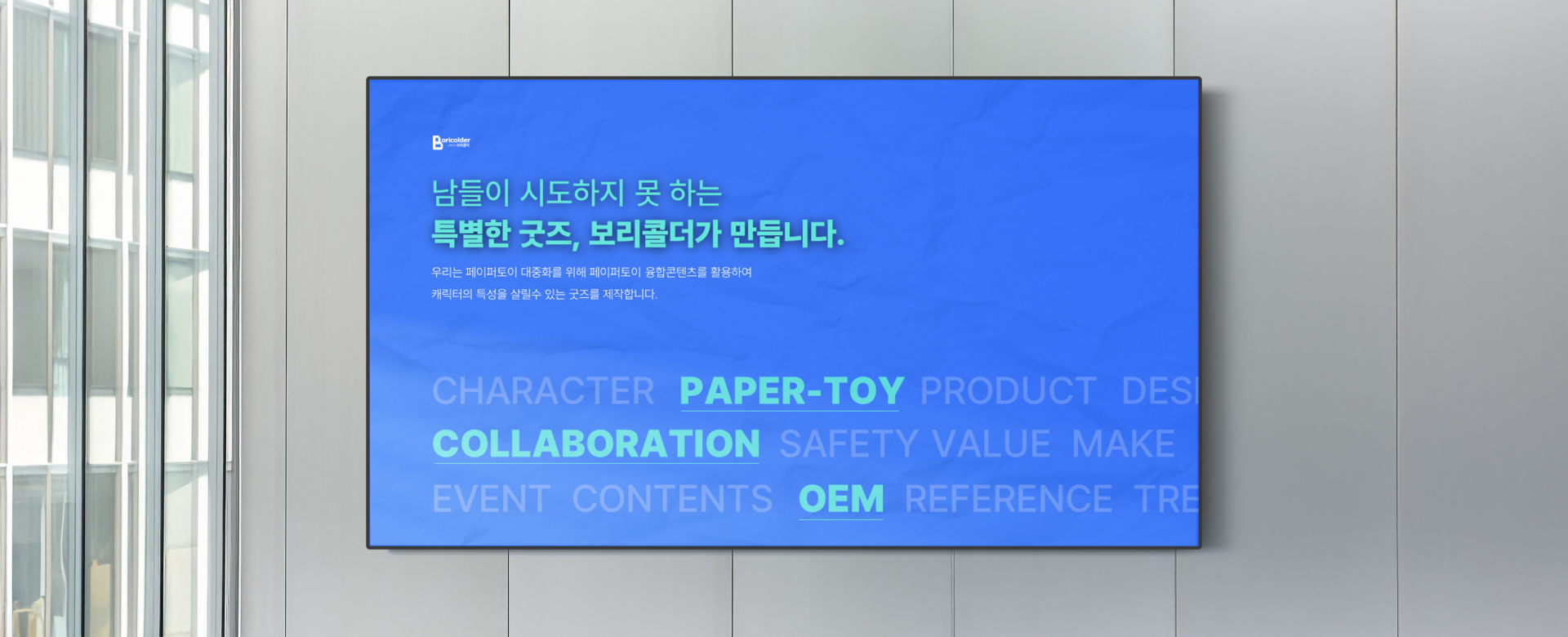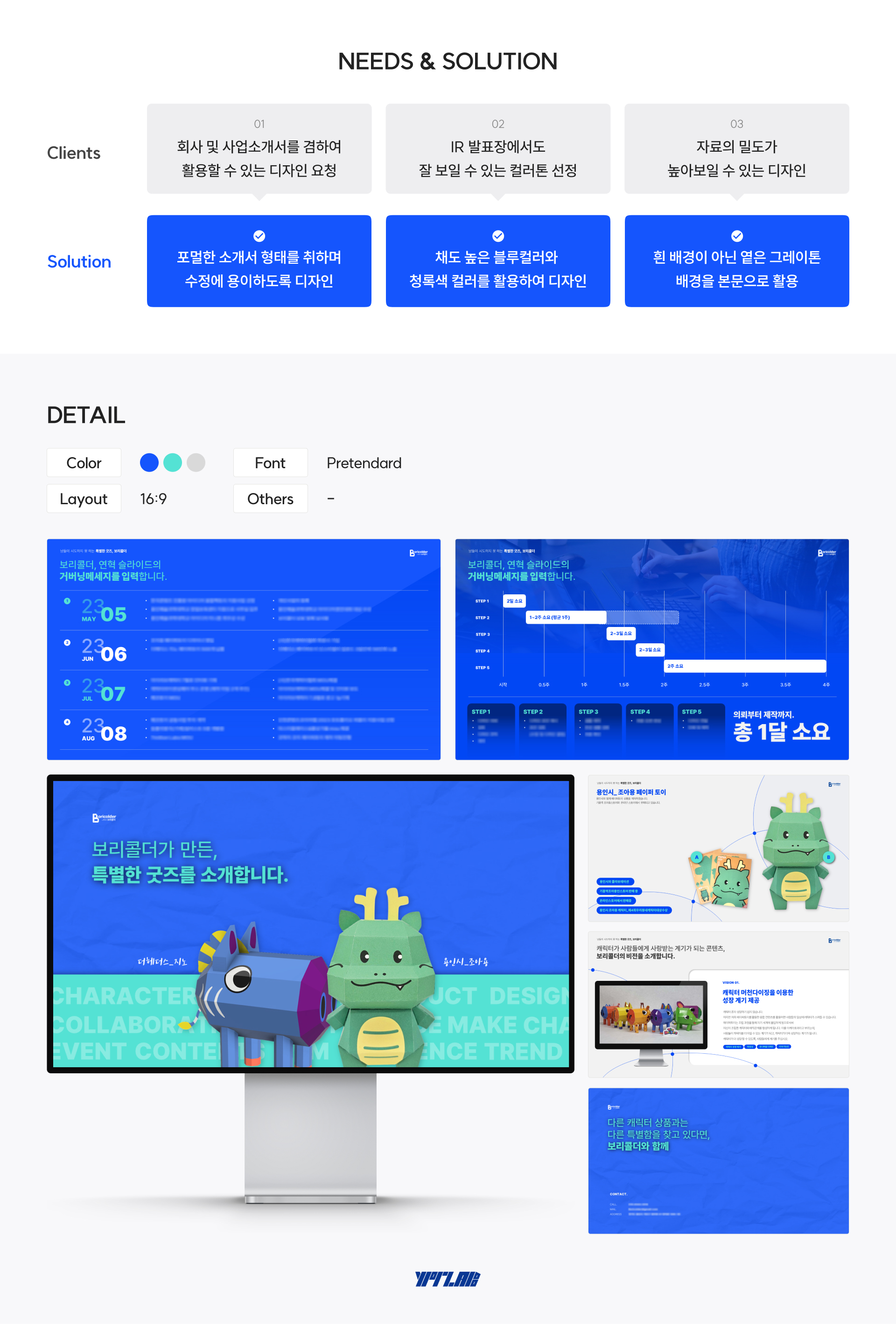 인천콘텐츠코리아랩 IR제작 | 보리콜더 overview 1. 회사 및 사업소개서 겸용으로 활용 가능한 형태로 제작 2. 프레젠테이션 전체 구성 기획 및 브랜딩 작업 클라이언트의 니즈에 맞춰 프레젠테이션의 전반적인 기획 및 프레젠테이션 플로우와 톤앤매너를 설정하여 작업이 진행되었습니다. 페이퍼토이의 완성도와 사업확장성을 중점적으로 표현하였습니다. 클라이언트 인천콘텐츠코리아랩 작업기간 3주 작업분량 약 20 슬라이드 카테고리 소개서 본문 이전글 대구글로벌웹툰센터 조성 및 운영사업 기본계획 수립 다음글 인천콘텐츠코리아랩 IR제작 | 묭상가들