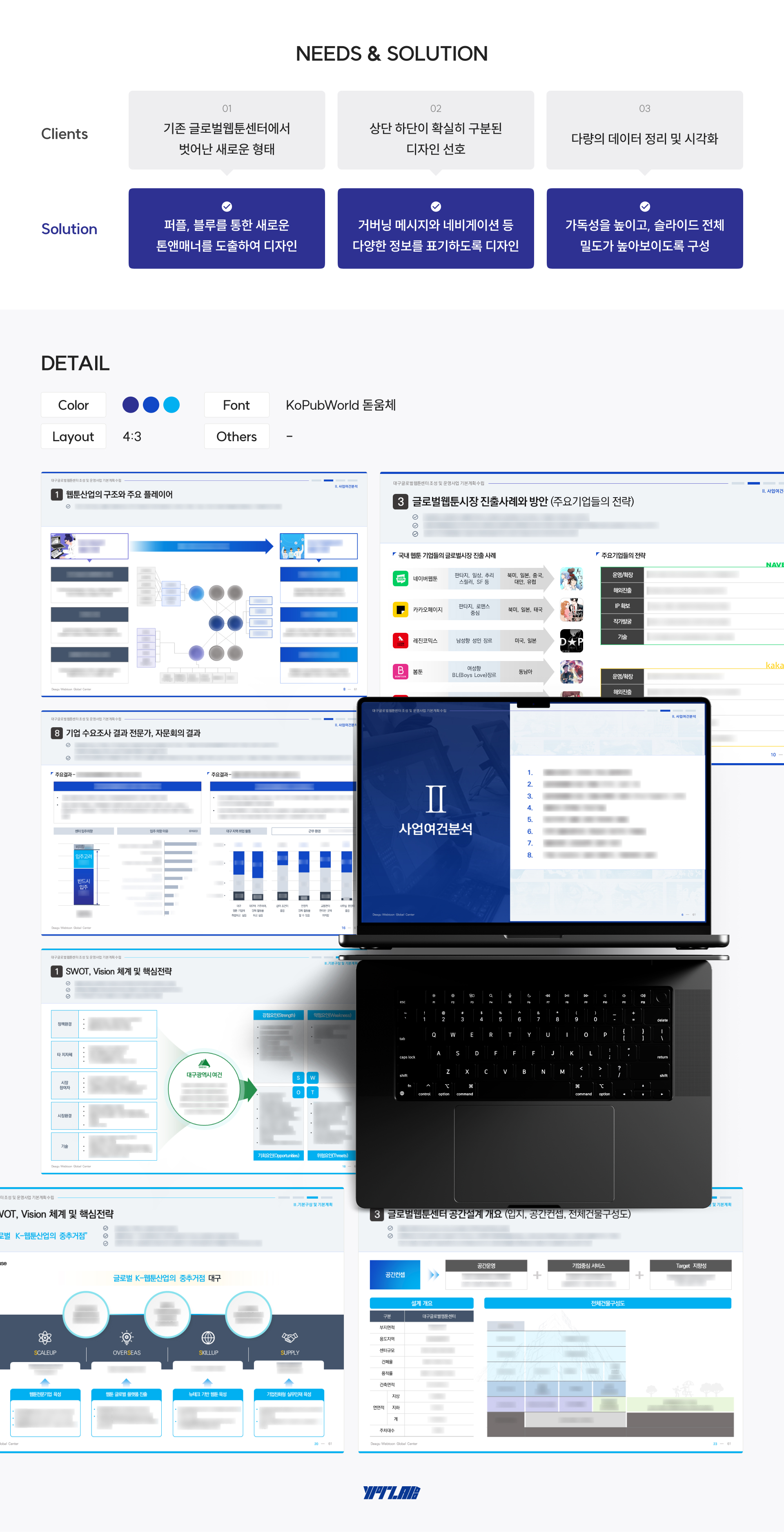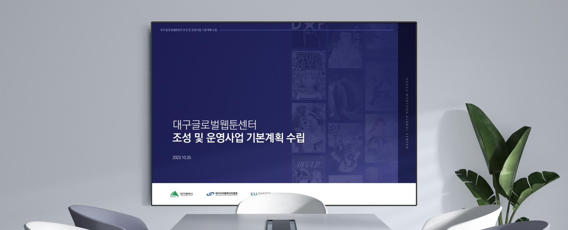 대구글로벌웹툰센터 조성 및 운영사업 기본계획 수립 overview 1. 다량의 데이터 정리 및 시각화 작업 2. 프레젠테이션 급속제작 작업 진행 대구글로벌웹툰센터 조성 및 운영사업 기본계획 수립 프레젠테이션의 1차 작업 이후 의뢰 진행이되어 새롭게 전체적인 톤앤매너 설정과 시각화 작업을 맡아 급속작업으로 진행했습니다. 클라이언트 DIP 작업기간 1주 작업분량 68 슬라이드 카테고리 발표자료 본문 이전글 MS DISTRIPARK | 영문 회사소개서 다음글 인천콘텐츠코리아랩 IR제작 | 보리콜더